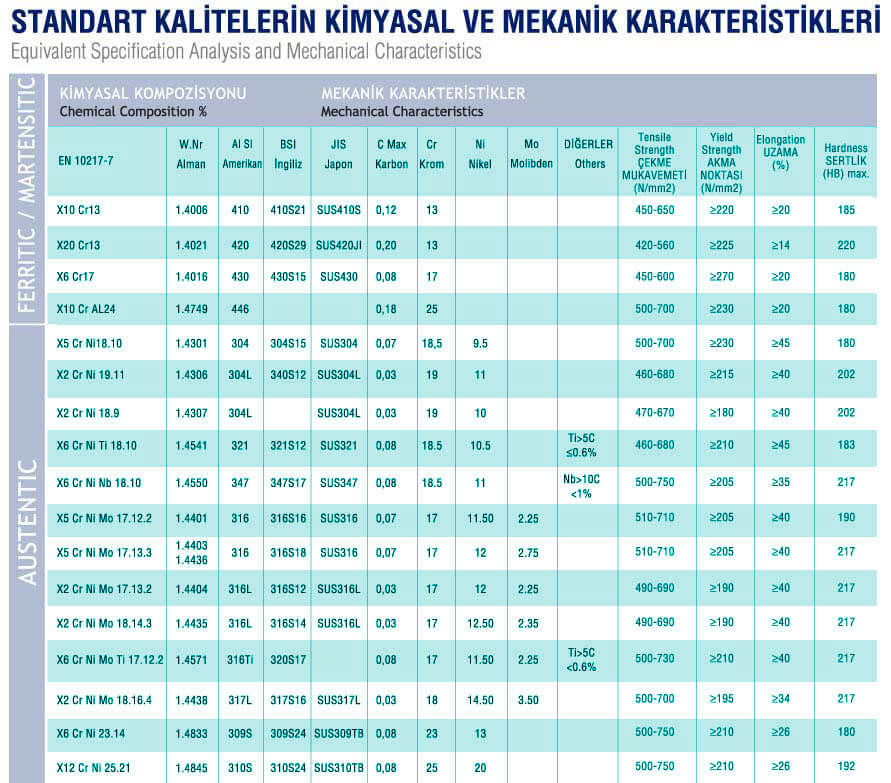 STANDART KALİTELERİN KİMYASAL VE MEKANİK BORULARIN