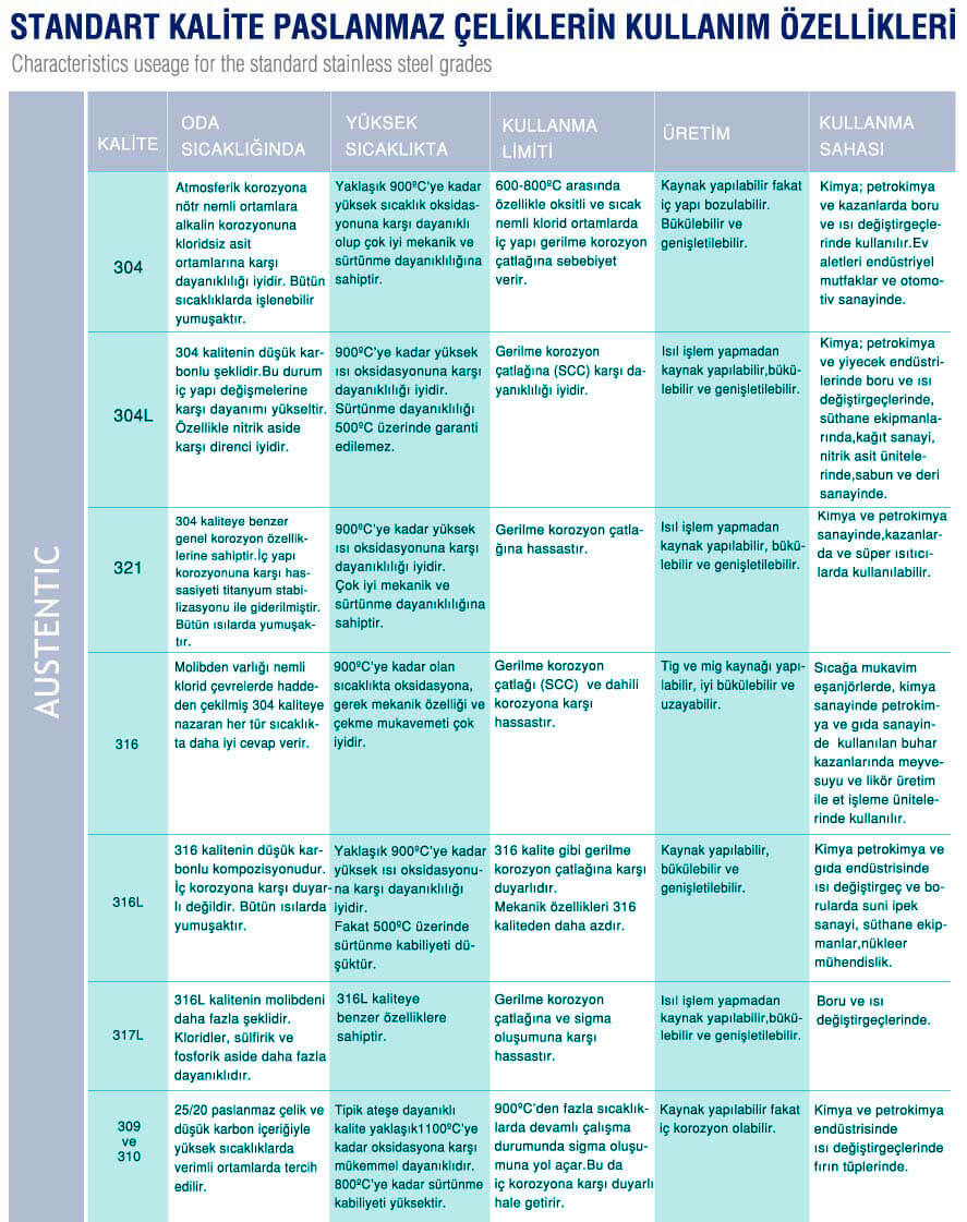 STANDART KALİTE PASLANMAZ ÇELİKLER KULLANIMLARI